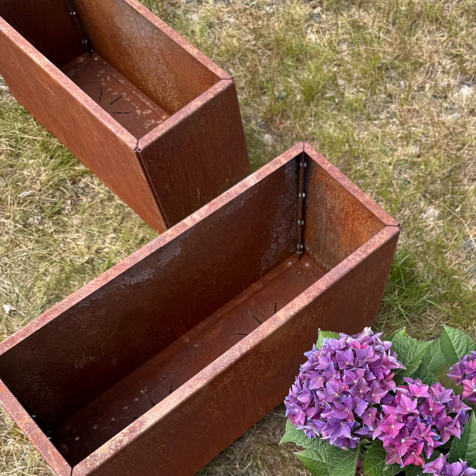 Corten-teräs on toimitettaessa hiiliteräksen värinen ja alkaa patinoitua ruosteiseksi ajan ja sään vaikutuksesta. Patinointiprosessi tekee jokaisesta laatikosta yksilöllisen.
